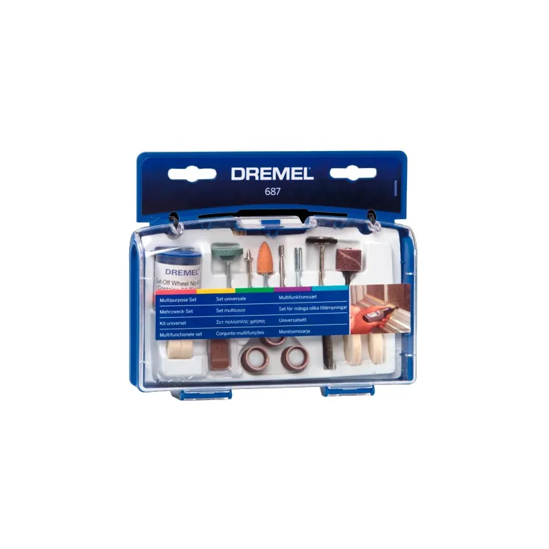 Kit de Accesorios Dremel 687, 52 piezas accesorios MultiUsos, Los juegos de accesorios de alta calidad incluyen una selección de los accesorios más vendidos. Cada juego incluye una selección de accesorios originales Dremel que, según el juego concreto, se pueden utilizar para llevar a cabo múltiples aplicaciones como amolar y pulir en diversos materiales
