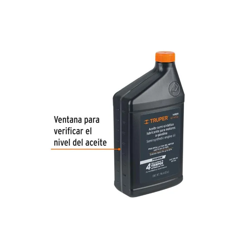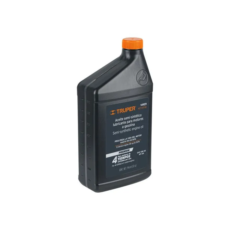 Aceite Semi Sintetico 0.5L SAE 10W-30 Para motor 4 Tiempos Generadores Motos Cuatrimotos, ACT-4T-16 14928 Truper Aceite semi-sintético con estabilizador Prolonga la vida del motor hasta un 50% No carboniza y facilita el arranque Baja emisión de humo Recomendado para motores OHV de 4 tiempos enfriados por aire