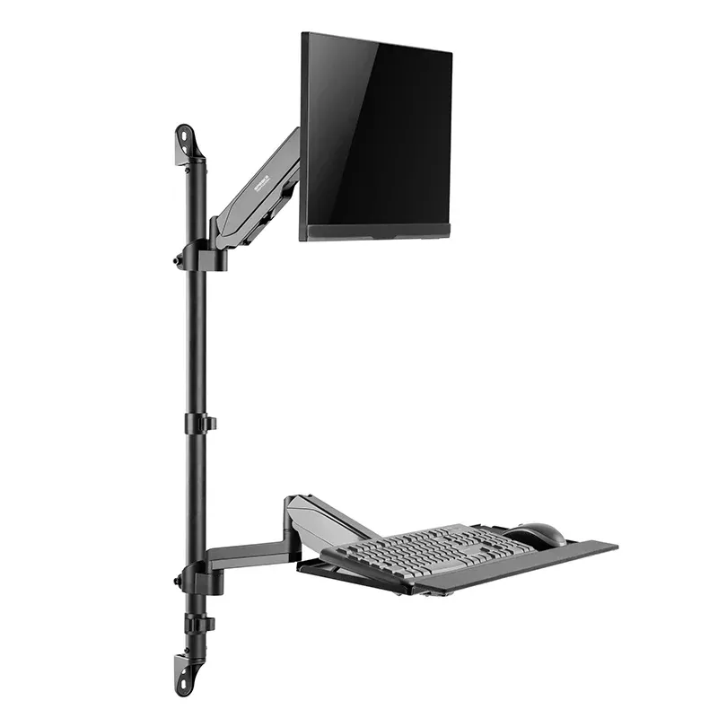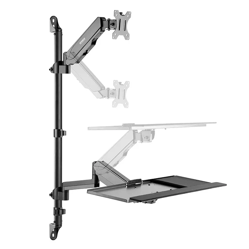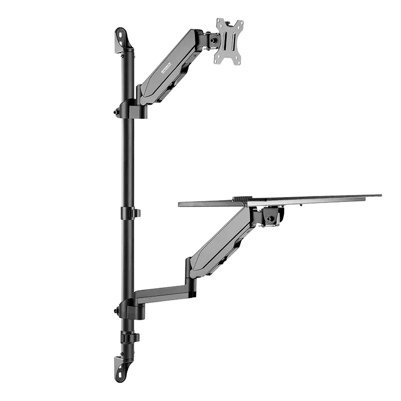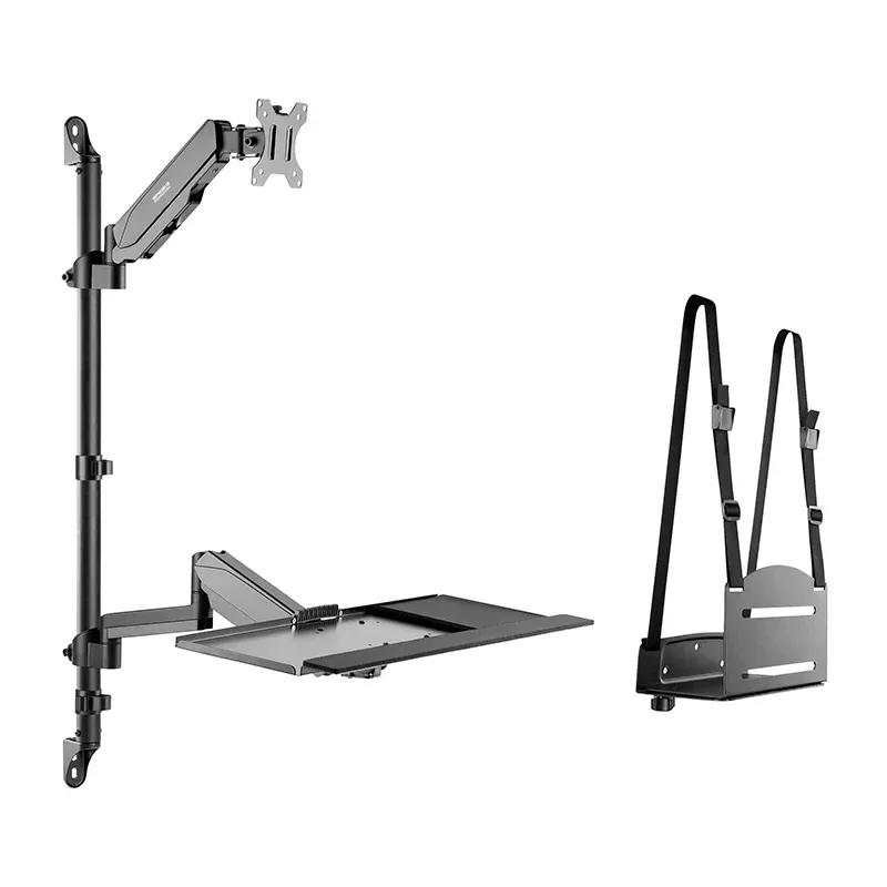 Soporte de pared para monitor profesional SpeaKa SP-MM-710, adecuado para una pantalla de 43.2 cm (17") 81.3 cm (32"). Este soporte incorpora un sistema de resorte de gas, que facilita el ajuste de altura y la posición del monitor con movimientos suaves y precisos. Además, permite rotación, inclinación y giro, proporcionando una visualización flexible y adaptada a diferentes necesidades de trabajo. Pensado para maximizar la eficiencia del escritorio, el modelo incluye bandeja para teclado y mouse y un soporte para CPU, lo que ayuda a mantener el área de trabajo organizada y liberar espacio en la superficie del escritorio.