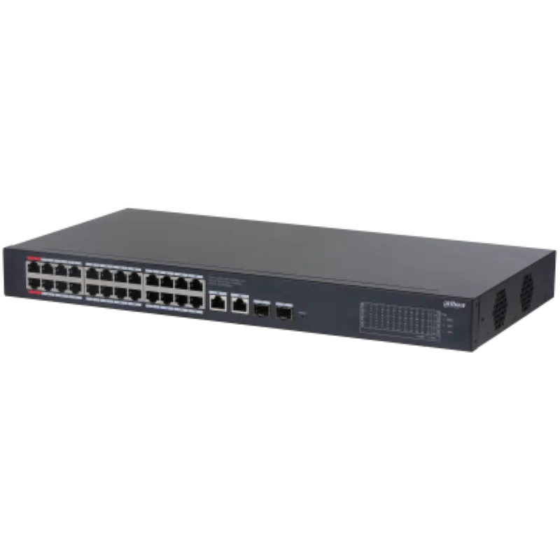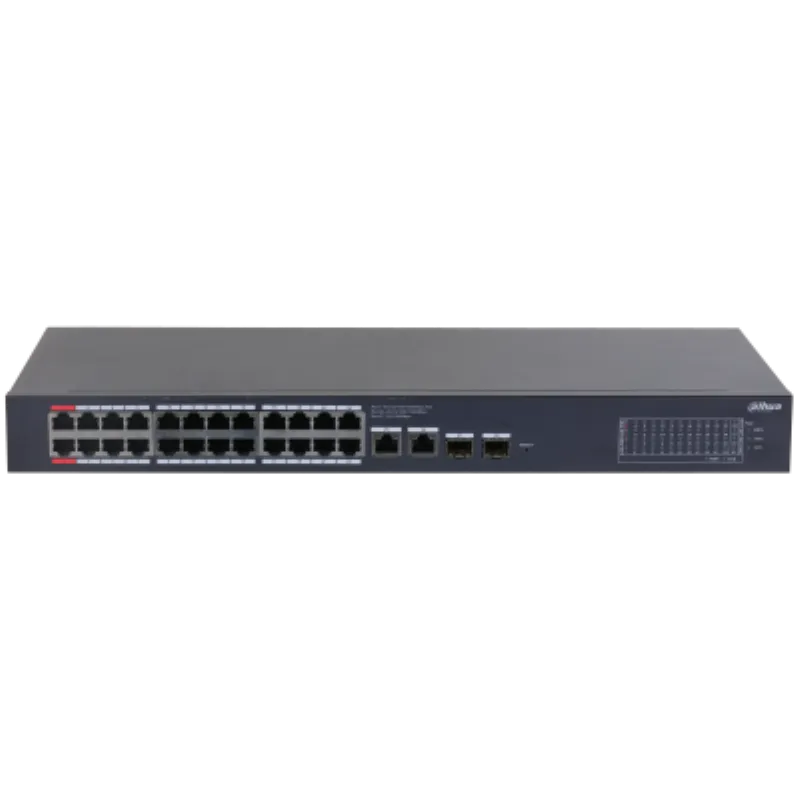 | Descripción de las ranuras de función | Puertos 1-24: 24 RJ-45 10/100/1000 Mbps (PoE); Puertos 25-26: 2 RJ-45 10/100/1000 Mbps (enlace ascendente); Puertos 27-28: 2 SFP 1000 Mbps (enlace ascendente) |
