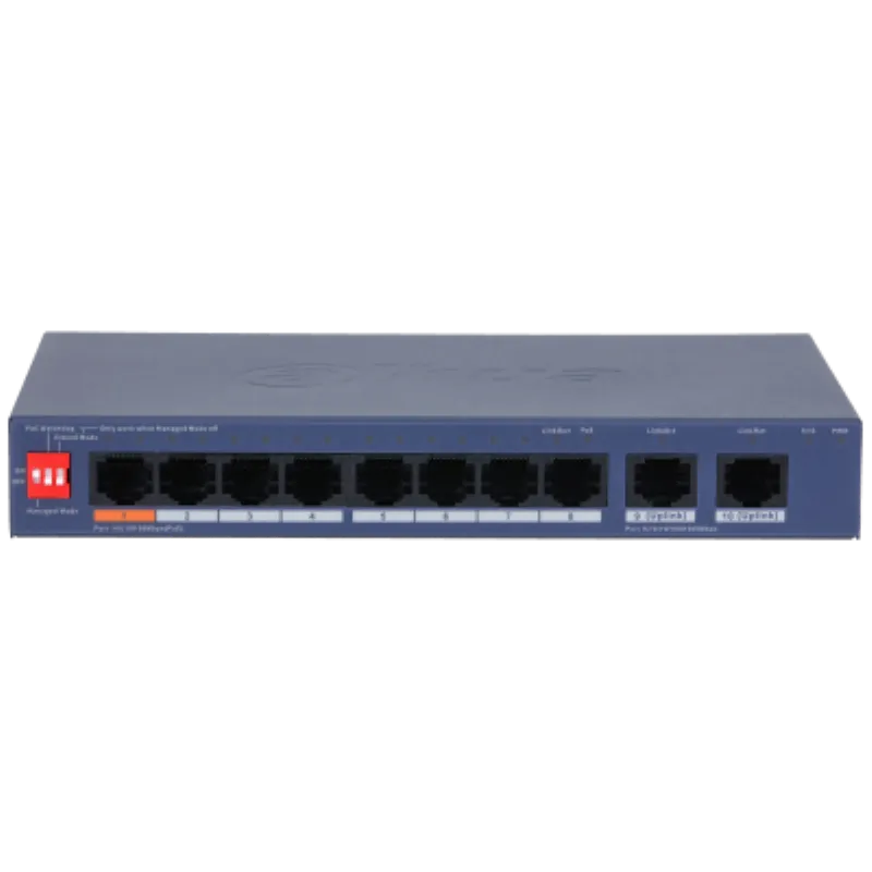 | Interruptor DIP | Modo Administrado: Activado por defecto para la administración web local y en la nube. Desactivado para el Modo No Administrado. Vigilancia PoE: Monitorea los puertos 1-8 y reinicia automáticamente el puerto PoE cuando no hay tráfico durante 2 minutos. (Solo funciona con el Modo Administrado desactivado). Modo Extendido: Puertos 1-8; distancia de transmisión de hasta 250 metros a 10 Mbps. (Solo funciona con el Modo Administrado desactivado). |