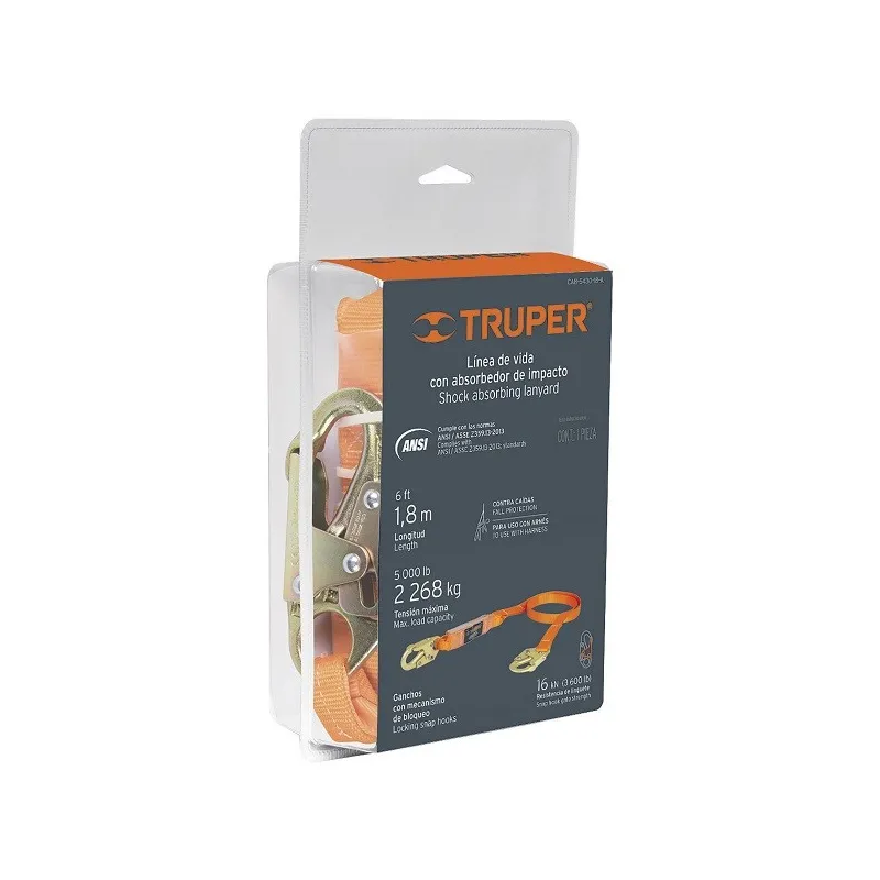 Kit contra caídas con arnes de tres anillos ANSI Truper 100887 Máxima carga de trabajo (140 kg incluyendo herramienta) Arnés de cuerpo completo con 3 anillos tipo "D" de acero forjado Ancla de conexión que permite anclarse a una estructura fija Línea de vida con absorbedor de impacto, cuerda de 1.8 m y  ganchos robustos de acero forjado 10X más...