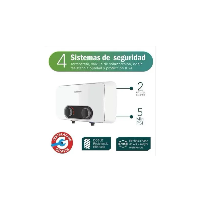 Rapiducha Eléctrica Premium EWI 5.5 KW Bosch 7736506800 Ideal para un solo punto de agua, brindando agua caliente ilimitada,Sensor contra sobrecalentamiento.Doble resistencia blindada que evita el contacto del agua con la corriente, no hay riesgo de descarga eléctrica.Sistema de seguridad: Termostato y Válvula de sobrepresión, suministrando agua caliente...