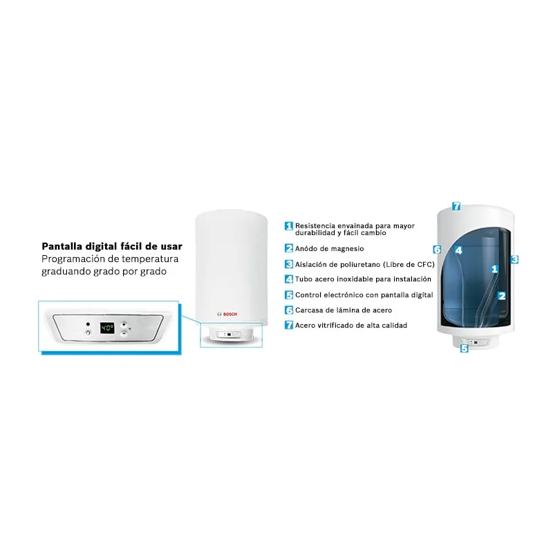 Terma Electrica Bosch Top 50 Litros 1.6kw, Panel Digital y Control de Temperatura Deposito vetrificado Instalación reversible