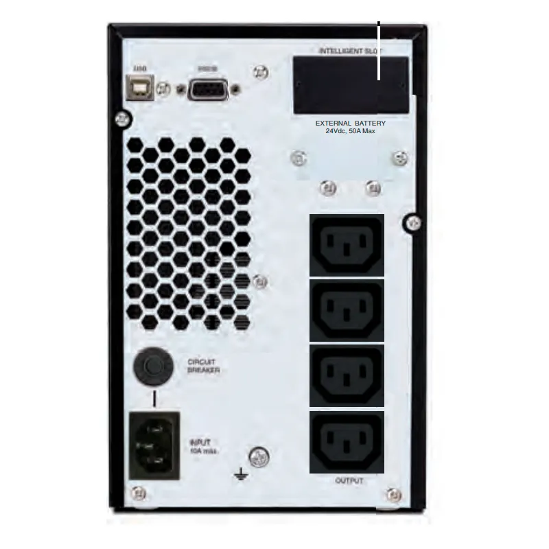 | SALIDA | VOLTAJE DE SALIDA: 208/220/230/240 VCA. REGULACIÓN VOLT. AC: +/-1%. RANGO DE FRECUENCIA: MODO BATERIA: 50 HZ +/-0.1 HZ - 60 HZ +/-0.1 HZ. CORRIENTE DE CRESTA: 3:1. TIEMPO DE TRANSFERENCIA: MODO AC A MODO BATERÍA: CERO. TIPO DE ONDA (MODO BAT): SENOIDAL PURA. |