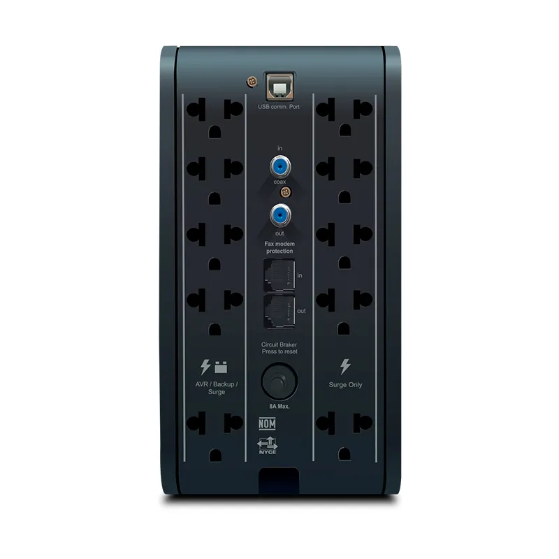 Es un UPS Inteligente (No Break) con diseño tipo minitorre con pantalla LCD y con un regulador de voltaje automatico (AVR), supresor de picos incorporado, puerto USB para recarga de celulares, tabletas y dispositivos electronicos. Ideal para proteger computadoras, sistemas de red y videojuegos. Rango de voltaje de entrada: 154 - 290 VCA. Voltaje de salida: 220VCA, Display digital LCD multifunción. Proteccion de linea de datos: RJ-45, Tipo de batería: 12VDC 12V / 9Ah. Tiempo de recarga: (al 90%): 4-horas, Breaker termomagnetico AC (Modo de linea). Dimensiones (Largo x Alto x Profundidad): 11.00 x 20.70 x 23.00 cm / Peso 6.33 kg.